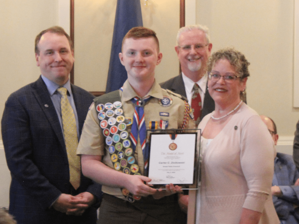 Brooks Emo is 14 years old and a member of Troop 4077B which meets at the Nunda Rotary Club. On December 12th, 2024, Brooks was going hunting with his stepfather. It was a cold morning and the temperature was in the teens.  As they drove by their neighbor’s house, they saw someone laying on the ground in her pajamas next to her car. It was Melissa Anderson. Brooks assessed the situation. Melissa appeared to have a broken ankle. She was conscious but was disoriented, could not speak and was hypothermic. Brooks took the mail in her hand, called 911 for help and gave them all the info they needed including her address from her mail. Brooks then called his sister to bring blankets to keep her warm. He proceeded to the main road to flag down the first responders. Brooks did all the right things. For this the Great Falls Council would like to present Brooks Emo the Medal of Merit.