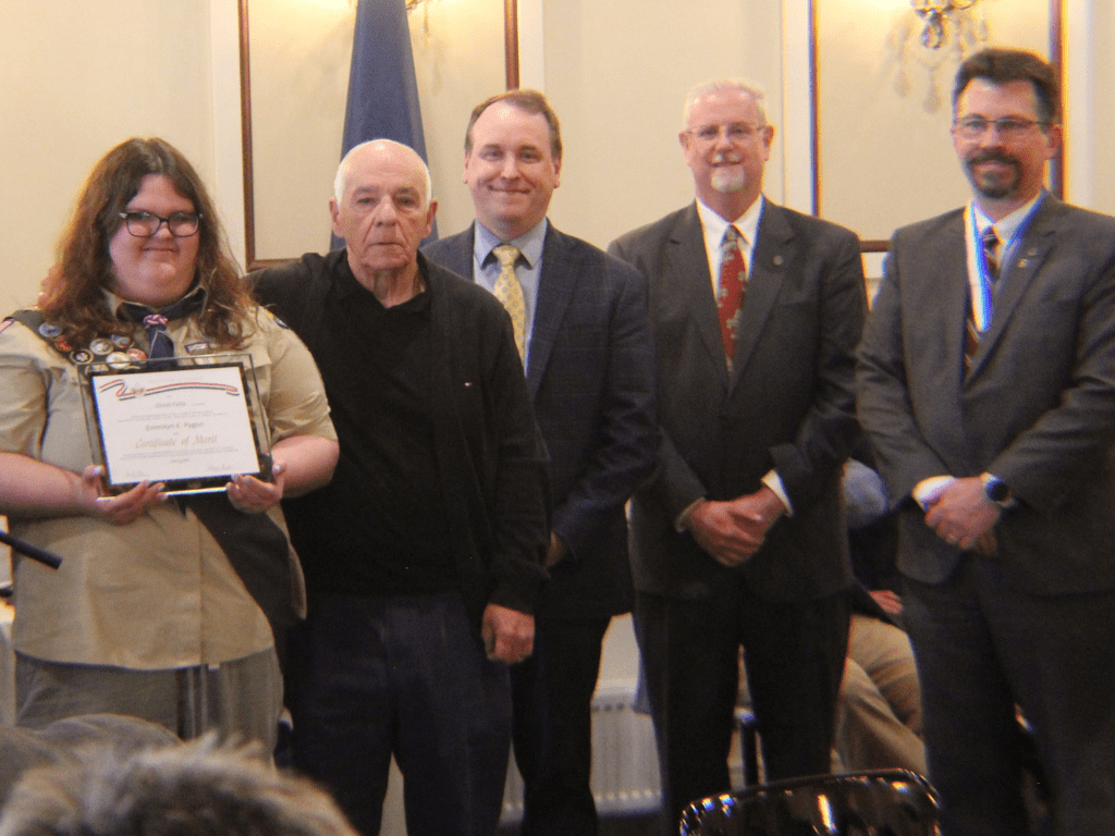 Emmilyn Pygon is 15 years old and a member of Troop 229G which meets at Kenmore Baptist Church. On September 13th, 2024, Emmilynn was playing cards with her grandparents and her mom. Her grandfather, Howard Litz, seized up, could not communicate and slid out of his chair to the floor.  Emmilynn’s mom and grandmother panicked, screamed and started crying.  Emmilyn stayed calm and took immediate action. Emmilynn called 911 and gave all the information requested including her grandfather’s history of heart conditions including his 2 strokes he had in recent months. She cleared the scene so that medical personnel had access to her grandfather and went to the door to flag down medical personnel. Fortunately, at the hospital, it was confirmed that Emmilynn’s grandfather had a seizure and not a stroke. Emmilyn did all the right things. For this the Great Falls Council would like to present Emmilyn Prygon with the Council Certificate of Merit.